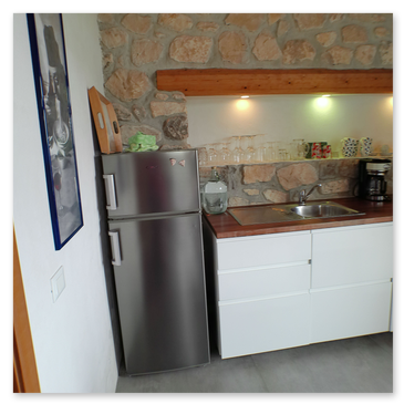 - Küche: Kochfeld, Backofen oder Mini-Ofen, Kühlschrank mit Gefrierfach, Filterkaffee/Italian Moka, Geschirr & Töpfe